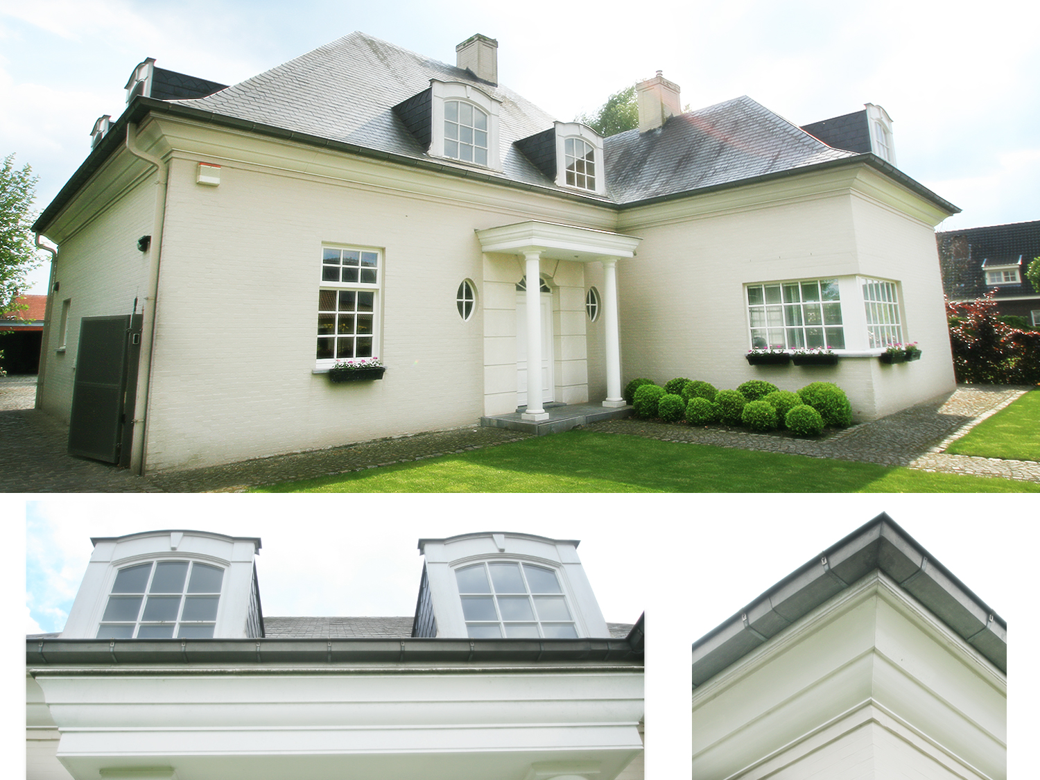 Volledige constructie van een hoornboomdak met verschillende dak-kapellen en oversteek met sierlijsten. (Klik op de foto om meer te zien!)